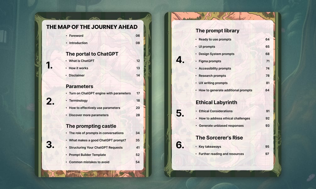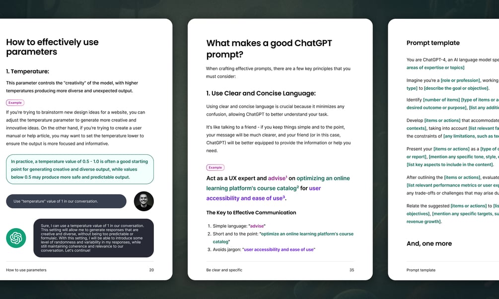Instead of writing a lot of boring high-level AI theory in tons of chapters, I've written six chapters that cover the most important things you need to know about ChatGPT as a designer, including parameters, prompts, templates, and more.